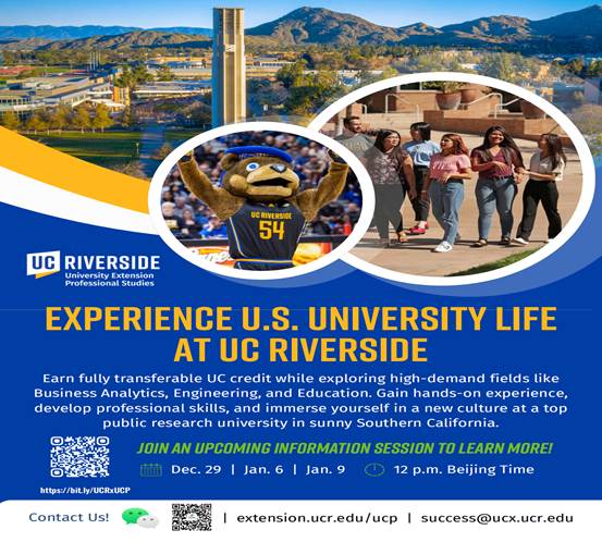 加州大学河滨分校继续教育学院将面向国际学生,在线介绍其大学学分项目(University Credit Program, UCP)。该项目为访问学生提供在UCR修读课程并获得可转学分的机会,涵盖商科、工程、教育学等领域,无需申请正式学位录取。