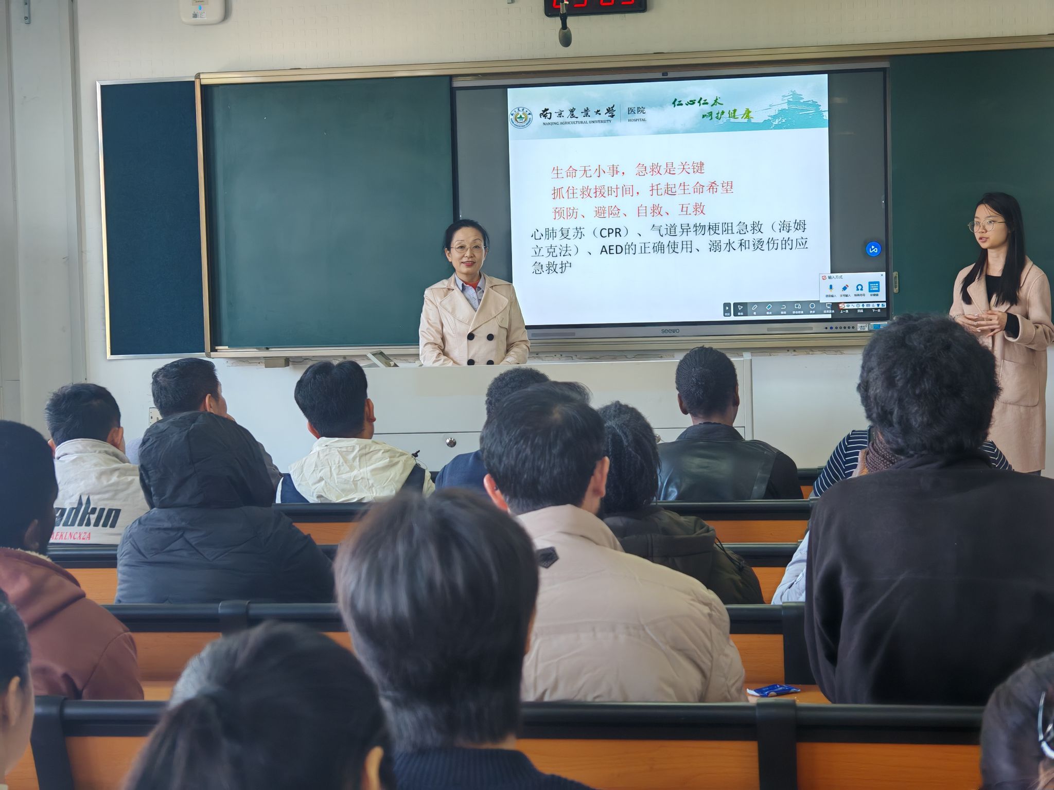 在中医文化与急救知识讲座中,校医院主任中医师杨桂芹以通俗易懂的语言,将中医“天人合一”的整体观与养生智慧娓娓道来,并现场演示了心肺复苏等实用急救技能。她贴心提醒同学们,在异国他乡要注重规律作息与饮食均衡,善用中医智慧守护自身健康。
