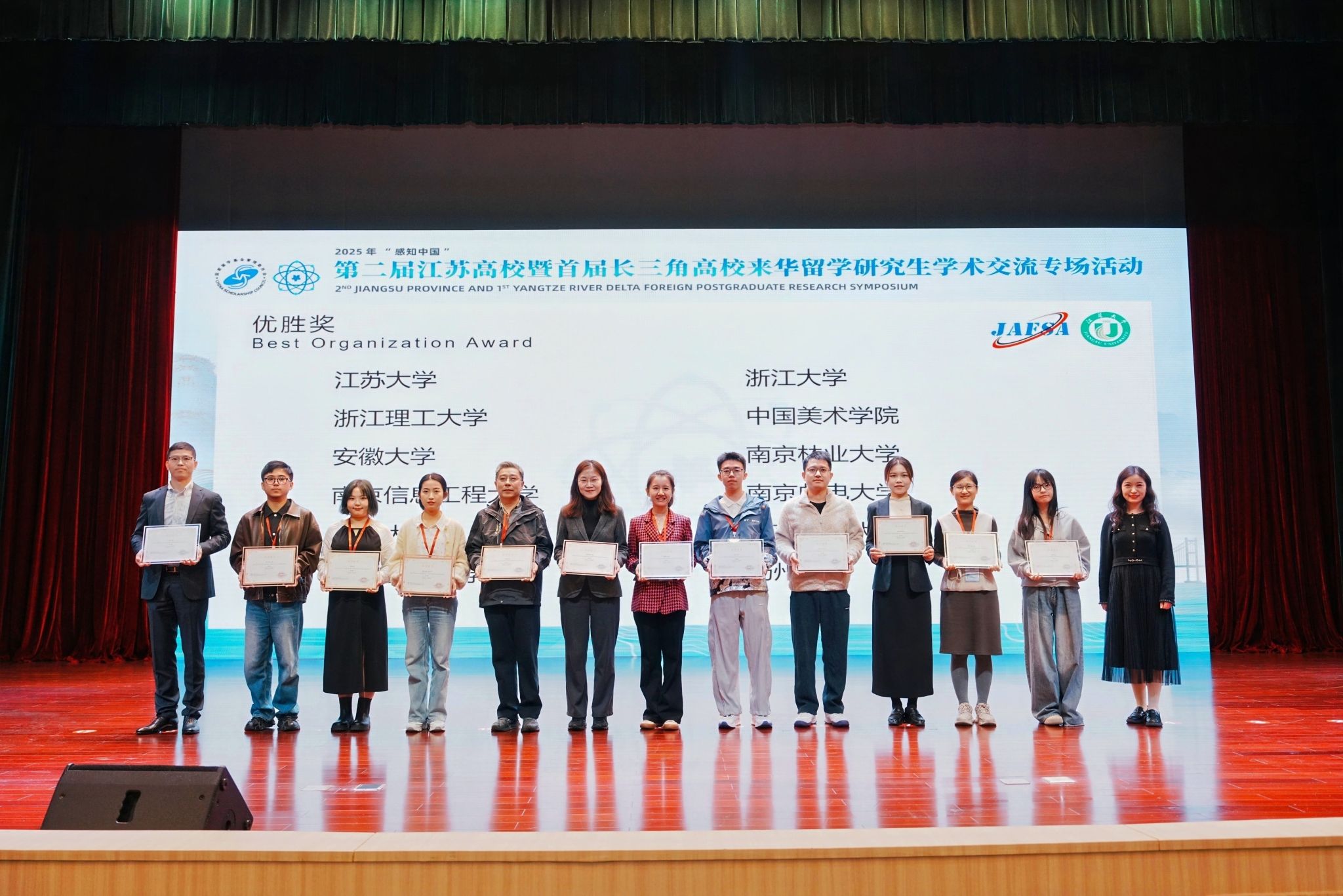 10月25-26日,由国家留学基金管理委员会主办的2025年"感知中国"第二届江苏高校暨首届长三角高校来华留学研究生学术交流专场活动在江苏大学举行。本次活动以“学术探索与文明互鉴”为主题,吸引了来自上海、江苏、浙江和安徽的55所高校的400余名中外研究生以及带队教师参与。我校推荐的4名学生代表均受邀参加交流并取得佳绩,共获得学术论文一等奖2项、三等奖1项、优秀奖1项、最佳学术墙报奖2项,学校获团体优胜奖,获奖人数和奖项层级在长三角地区参与高校中名列前茅。