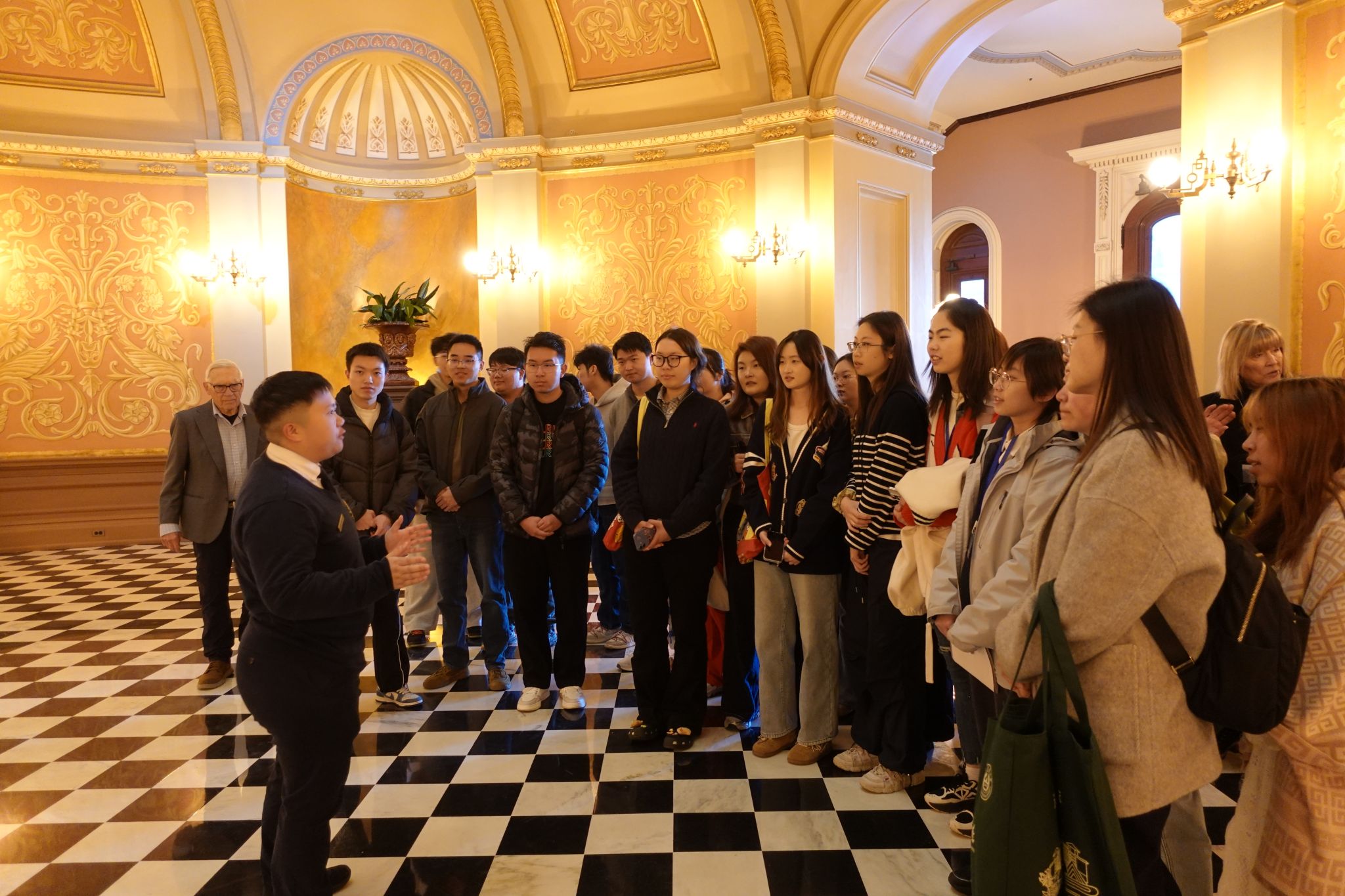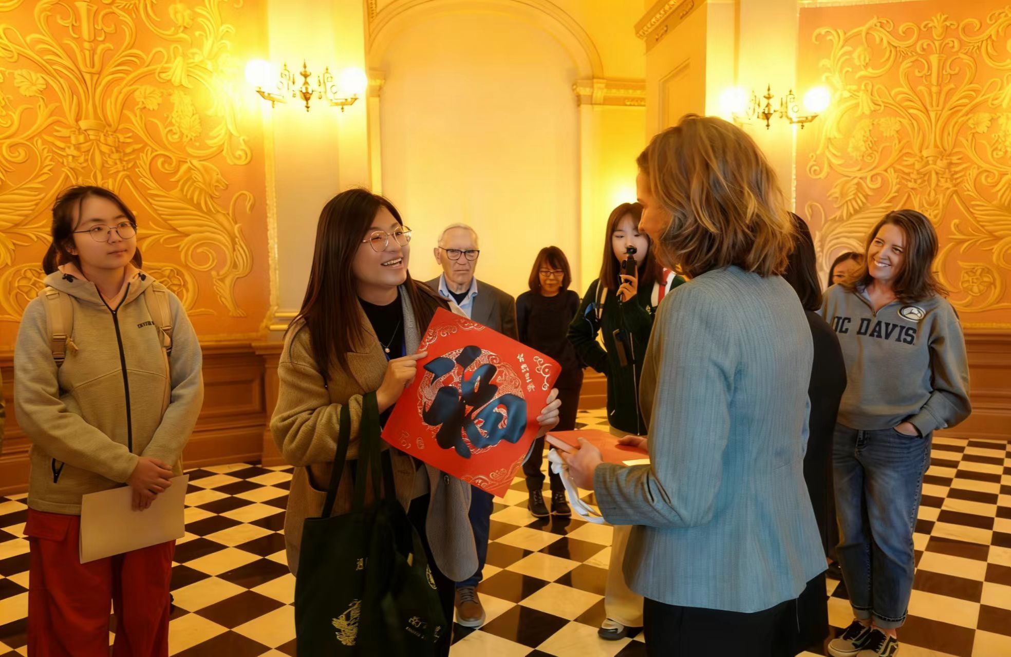此次交流项目恰逢江苏省与美国加州建立友好省州关系15周年,交流团专程参访了加州州政府议事大厦,与州政府工作人员开展友好会谈。刘素惠代表交流团回顾了2011年江苏与加州建立友好省州关系的重要意义,重温了2023年加州州长纽森访问江苏期间,在盐城湿地珍禽国家级自然保护区与丹顶鹤“加利福尼亚”亲切互动的温馨场景,向美方工作人员传达了来自江苏的诚挚问候,并向加州州政府工作人员赠送了南京农业大学文化纪念品及寓意吉祥的“福”字,传递了南农人对江苏与加州、中国与美国友好关系永续发展的美好祝愿。州政府工作人员Madeline Roorda等对交流团的到来表示欢迎,她表示,与交流团师生的交流让他们深切感受到中国文化的魅力与中美民间友好的温度。